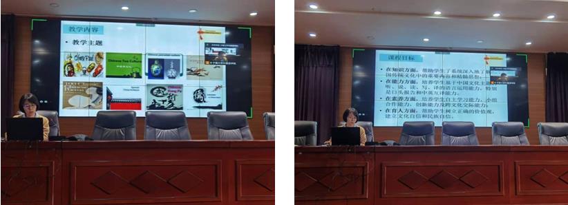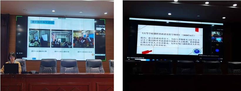 郭晓燕老师以我校《中国文化英语》课程为例,围绕该课程的课程思政建设,针对“线上线下混合式教学设计”案例进行了介绍。郭老师通过介绍了课程开设背景、课程目标、教学材料、教学主题、教学评价、教学考核方式、课程和教学改革解决的重点问题,详细地介绍了团队教师在课程思政教学内容挖掘、学生活动设计,以及课程思政元素在教学评价中的设计等。同时,运用“以学生为中心”和“以产出为导向”的认知递进式教学法进行教学设计。主要包含课前主题相关材料讨论和整理,课中主题翻译练习、主题试听练习、主题词汇应用、以及主题小组翻译比赛活动,外加课后线上线下采访、设计单元测试卷、主题作文活动以及主题“明信片”设计的课后拓展活动,帮助学生系统了解中国传统文化重要内容、培养了学生中国文化主题听、说、读、写、译的语言能力,而且还培养了学生的分析表达能力、创新思维能力、总结概括能力、小组合作能力、跨文化交际能力以及学生自主学习能力。最后,以“中国瓷器”主题为教学案例,深入地介绍了如何在课程中融入思政元素,达到“润物细无声”的效果,从而将语言目标、知识目标、素养目标和育人目标做到有机统一。