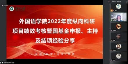 2022年度纵向科研项目绩效考核答辩暨国基金申报、主持及结项经验分享会”。会议由学院副院长胡笑瑛主持,有5位答辩评委和8名科研项目主持人参加会议。