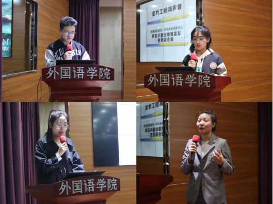 王力、王雪娇、田天和马薇四名同学分别代表英语(师范)专业集体实习、小语种集体实习和英语(翻译)专业自主实习分享他们的精彩实习经历。发言同学纷纷表示在实习中要发现问题、解决问题,要敢于尝试、不惧表达,以追求完美的态度去教学、实践才能达到近乎完美的教学和实践经验。通过本次实习,同学们在反思中学习,在学习中总结,不仅锻炼了个人能力,而且增进了与同伴和老师之间的感情。同学们深感收获颇丰。