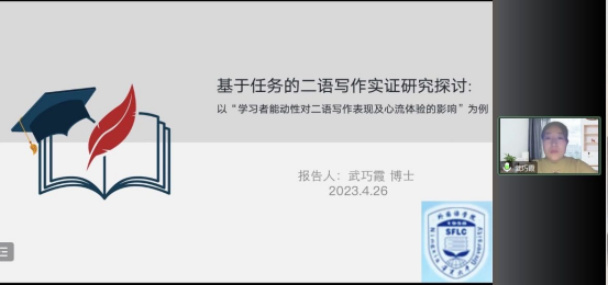 主讲人武巧霞博士首先从认知、社会文化和积极心理学视角分析了设计二语写作时需要考虑的因素和应该关注的重点,然后以学习者能动性对二语写作表现及心流体验的影响研究为例,从选择研究领域、研究问题设计、研究数据及结果分析以及结论的推导为线索,梳理了研究过程中各环节的要点以及如何保证研究设计的有效性,为大家呈现了较为完整的研究思路和研究设计,对二语写作教学及研究具有很大的启发作用。