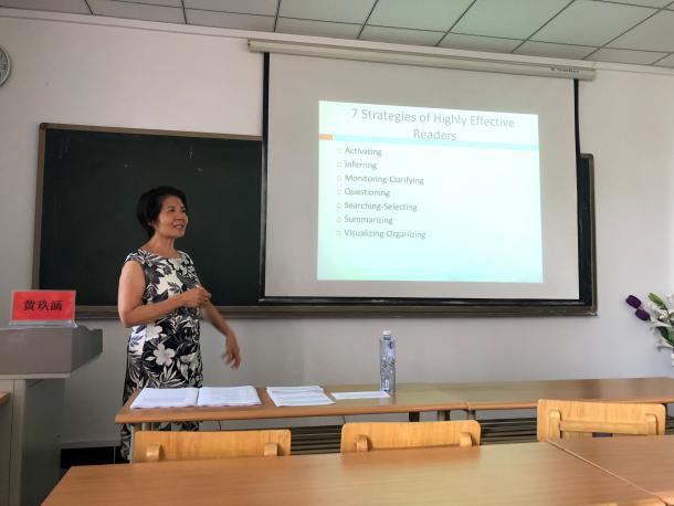 在讲座中,黄老师就提高学习外语阅读能力的七大战略:1.Activating,2. Inferring,3. Monitoring. Clarifying,4.Questioning, 5. Searching. Selecting, 6. Summarizing,7. Visualizing. Organizing等进行了详细的解答。 她逻辑清晰、论述生动有趣的讲座,高潮迭起,互动频频,受到了师生的好评。