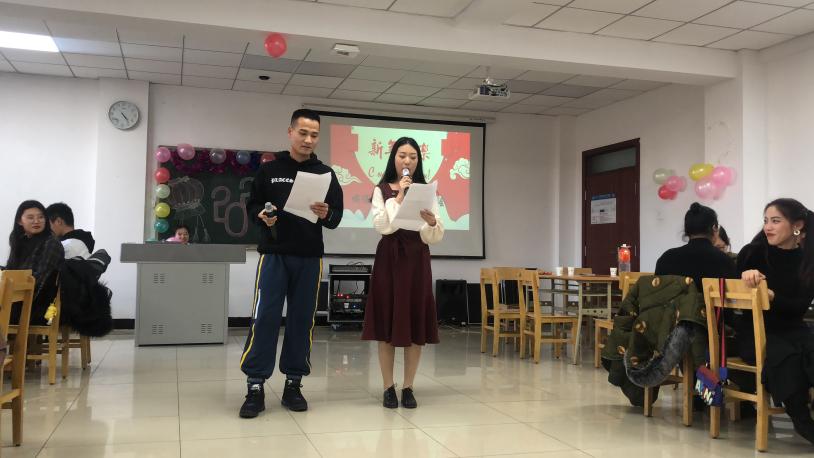 夕阳缓缓落下,夜幕降临。教室被装饰一新,桌上摆满了美味可口的零食和饮品,室内一片欢声笑语,洋溢着和谐喜庆的节日气氛。16时15分,在主持人张珈僮、马佳旺热情幽默的开场白下,晚会正式拉开帷幕,全场响起热烈掌声。