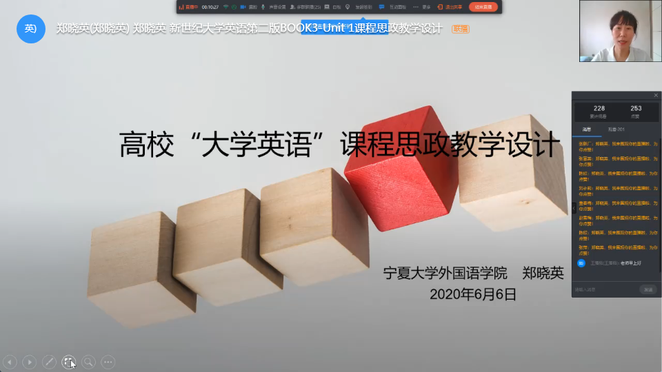 公外部选派郭晓燕、郑晓英、朱海燕三位教师分别于5月16日、6月6日和6月18日在钉钉平台上围绕“外语课程思政”主题进行教学设计和在线直播。全国各地2万多名外语教师在线观看,并进行了线上交流与互动,对三位老师关于《大学英语》课程思政的精心设计和精彩示范给予了充分肯定。