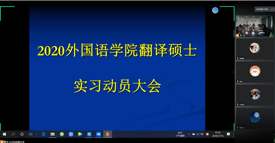 2019级翻译硕士学生实习动员大会于2020年7月16日上午10点通过腾讯会议召开。余洁副书记、朱海燕副院长、学位点负责人谢丽欣老师、全体实习指导教师以及2019级口笔译研究生参加了此次会议。会议由MTI硕士学位点负责人谢丽欣老师主持。