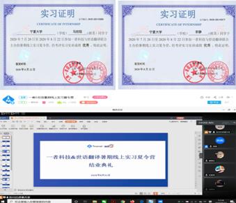 此次线上实习活动不仅有个人任务,还有学生四人一组进行的团队合作项目。参与此次线上实习任务的2019级笔译班同学说道:“自己从本次线上实习活动中收获颇多,对网络翻译技术也进行了深入的了解,学会运用该技术去进行翻译工作。”也有同学表示,“这次线上实习从一个人独立完成项目,到四人一组的小组分工、协同合作,都是这次线上实训的宝贵经验”。实训结束时,有6名同学荣获“优秀学员”的称号,其他学生均获得“优秀”实习证明。