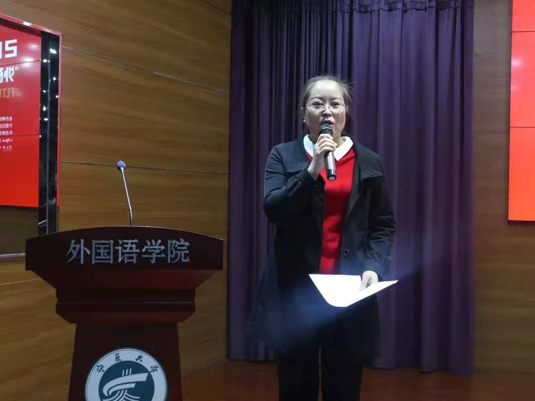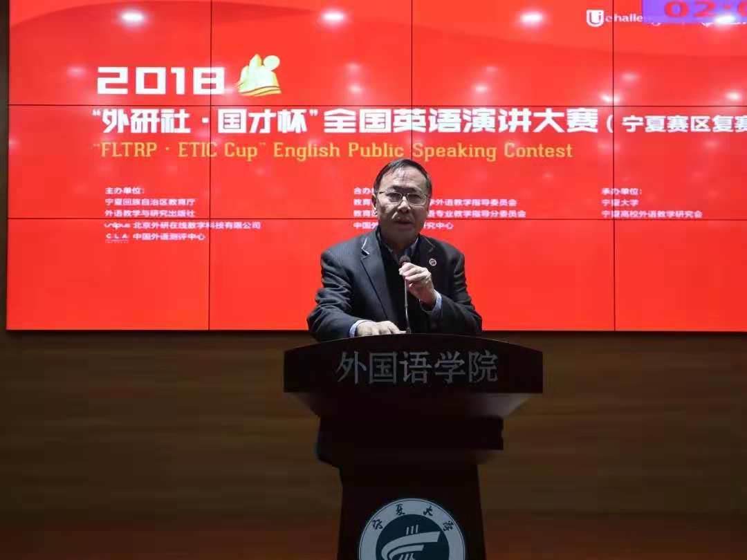谢应忠副校长在大赛开幕式致辞中讲到,“外研社杯”的英语赛事历史悠久、影响力大,是锻炼大学生英语语言能力、展现高校学子风采的大舞台。谢校长指出此次“外研社杯”英语大赛宁夏赛区复赛由我校承办,是我校的荣幸,它不仅丰富了我校校园文化生活,同时促进了全区高校师生的交流。他祝愿选手们在全国比赛的舞台上再创佳绩!