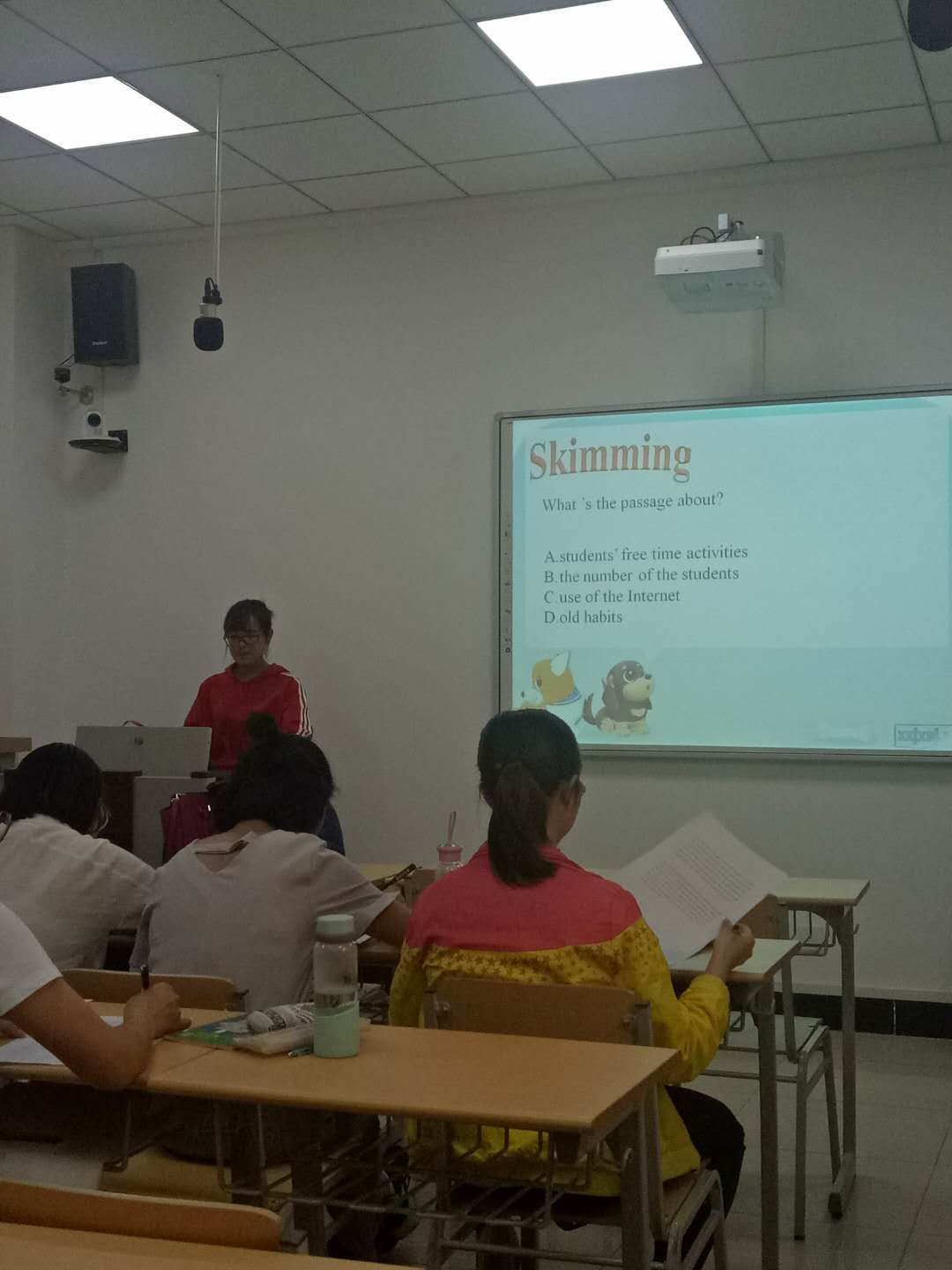 吴蓉老师所带的2015级英语专业《教学法》课程微格教学活动。在两节课的教学中,吴蓉老师安排了班里3名2015级本科生进行了微格教学的讲课实践。三个同学分别就初中英语里的课程内容以及阅读技巧进行了真实的课堂展示。从讲课环节来看,每个学生都能够按照任课教师所传授的教学法的知识以及课堂规范的要求,进行实践操作,讲课风格各具特色,但每个人也都有各自的不足和缺点。每个学生讲完,吴蓉老师都进行点评,并从教学法的角度给同学们提出中肯的建议,使同学们在教学实践的同时又补充了相应的理论知识。郭鸿雁教授对每个同学的讲课进行了耐心细致的点评,每个点评都妙语连珠、风趣幽默,引来同学们的阵阵掌声和笑声,听得同学们频频点头。郭老师希望同学们在今后的学习中注重加强语言基本功的训练和教学方法的研究,为毕业后成为一名合格的教师做好充分的准备。