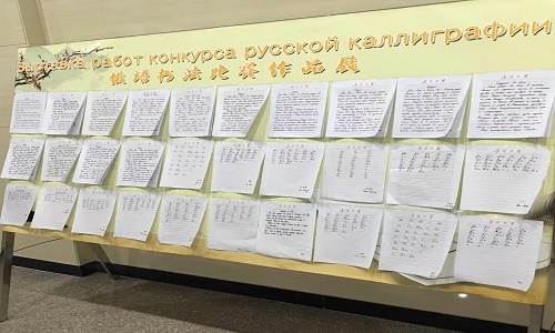 比赛内容由教研组事先规定,采取了征集作品的方式。同学们热情高涨,积极投稿,大多数参赛作品工整美观,流畅自然,尤为评委老师们称道的是同学们一丝不苟的书写态度。当师生走过学院一楼大厅时,都会被展板上一幅幅生动的俄语书法作品所吸引。同学们认真书写的这些俄语书法展品也受到了近期来h韩漫