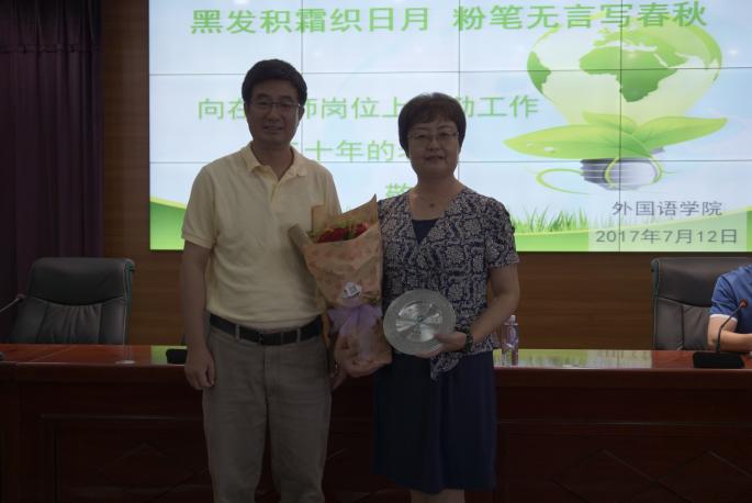 在403会议室举行了从教满三十年教师庆祝活动。拜发奎书记、周震院长共同主持活动。首先,拜发奎书记向从教满三十年的15名教师表示了热烈的祝贺和亲切的问候,并宣读了学院关于为教龄满三十年教师颁发纪念奖章的决定。伴随着欢快的歌声,周震院长向15位老教师逐一颁发纪念奖章并与他们合影留念。
