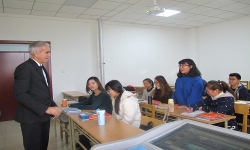 第二节课上,库尔班诺夫教授同学生们进行了长时间的口语互动交流。学生们用俄语就俄罗斯及中亚地区民俗文化、政治制度、城市、风土人情等广泛的话题同教授进行了对话。教授在课堂上不断启发和引导同学们,并细致解答了学生们的疑问。在俄语学习方面,库尔班诺夫教授给大家提出了许多关于学习外语的宝贵建议,他尤其鼓励同学们要积极大胆地练习俄语口语,不怕出错,坚持不懈。学生们积极参与课堂交流互动,兴致高昂,得到了教授称赞。通过此次授课,提高了学生对丝绸之路的深层认识,对土库曼斯坦和俄罗斯国家的了解,同时也增强了俄语口语交流的信心。
