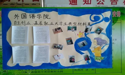 于一楼大厅展出了有关往届毕业生自主创业、基层就业的典型材料。材料以文字稿和图片的形式向大家展出,内容涉及基层就业、创业者的心路历程、总结的经验教训等。
