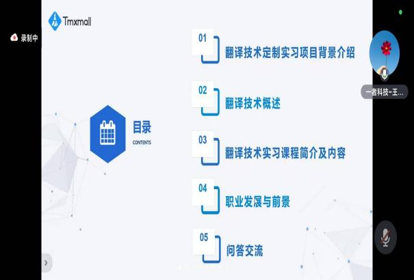王经理为同学们详细介绍了线上翻译实习任务,同学们看到,此次为期16周的翻译实习融合了高质量讲座、直播、录播课程及大量翻译实践,学习内容丰富、练习目标清晰,定制实习将帮助同学们在信息检索、语料库制作、译后编辑、翻译项目管理等翻译技术应用方面有所补充和发现。学院期待同学们能在本次实习活动中深入理解技术素养对翻译人才专业发展的重要性,也期待外院与一者科技的协同育人实习项目取得切实成果。