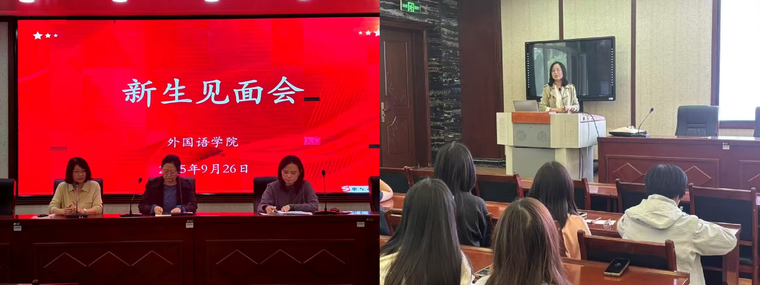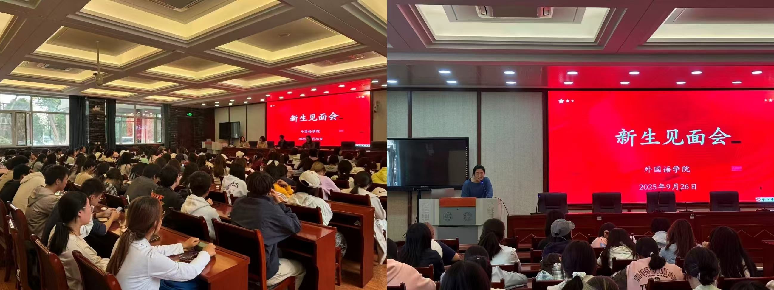2025级本科新生见面会在逸夫楼举行,负责本科教学的贾文娟副院长主持会议。贾文娟副院长首先向新生介绍了英语系各位系主任和2025级各班班主任,并对新生的到来表示热烈欢迎。贾院长围绕专业学习、个人发展与就业形势提出以下建议:一是要有专业认同与坚守,保持积极的学习状态,深入思考如何在本专业“生根发芽”。二是要有明确的学习目标与学业规划,要结合自身特长与兴趣制定短期与长期相结合的学习目标。三是要有就业前瞻性,学生要尽早将学业与职业规划相结合,注重全方位能力的培养。
